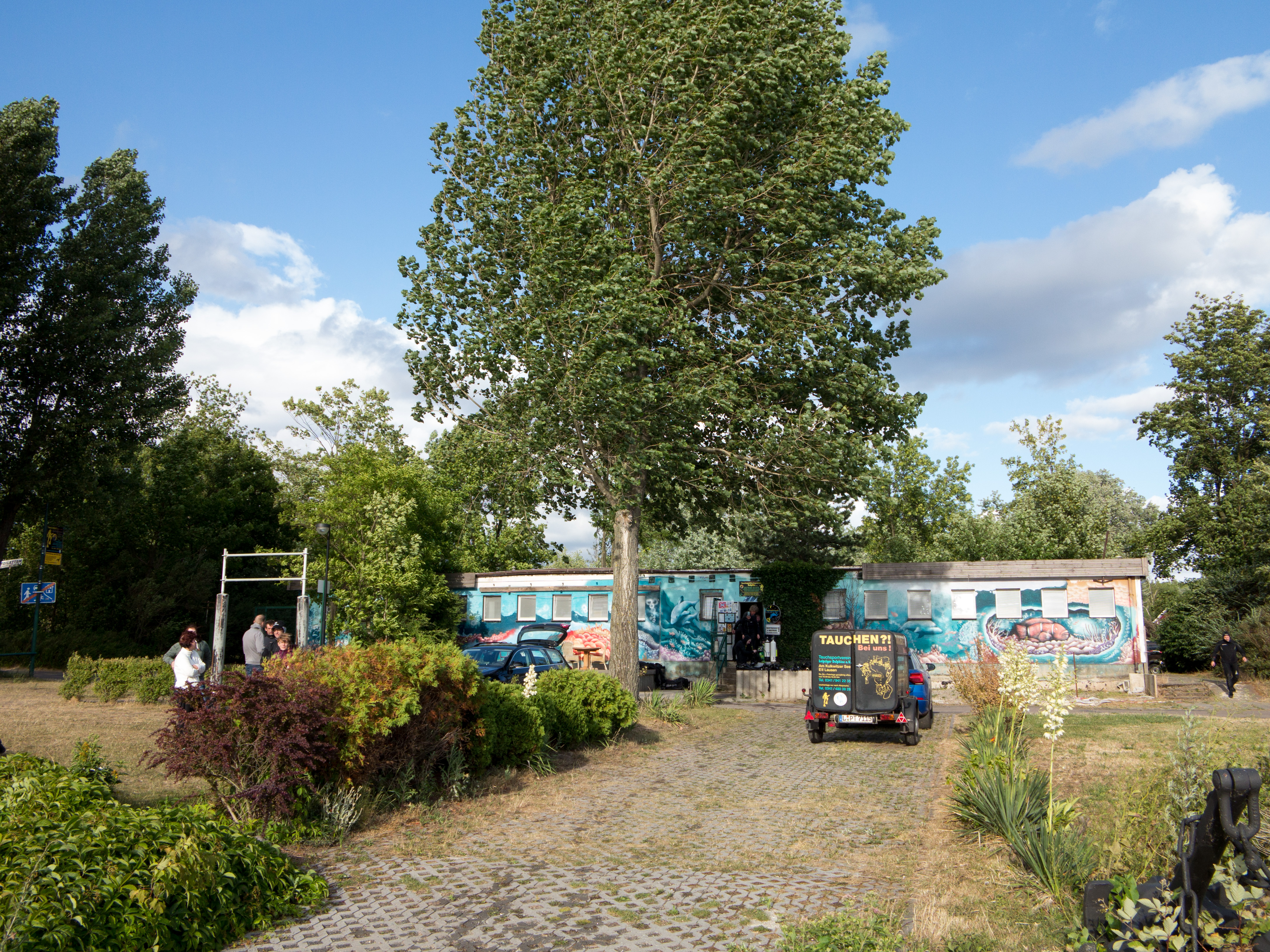 An der Tauchbasis trafen wir Reini wieder. Reini ist nur durch Reini zu ersetzen, denn in ihm findet sich ein ausgesprochen liebenswürdiger Zeitgenosse der die Tauchbasis / Tauchschule Delfin betreut. Ein ausführliches Briefing zum See (Reini: „Ich glaube die Platte hab ich schon mal gespielt…“) legte uns recht deutlich nahe den fünf Meter Bereich zum Ufer auf jeden Fall nicht zu betauchen. Am FKK Strand sind 10 m dringend einzuhalten – wir konnten keinen sehen.